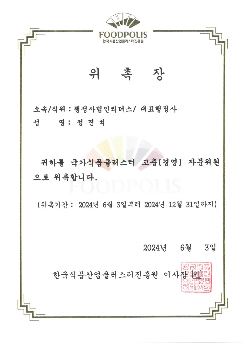 2024년 6월 3일 행정사법인리더스 정진석 대표행정사는 한국식품산업클러스터진흥원의 식품법률 고충(경영)자문위원으로 위촉되었습니다.