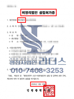 재단법인(비영리법인)설립허가증 발급완료_26년 03월