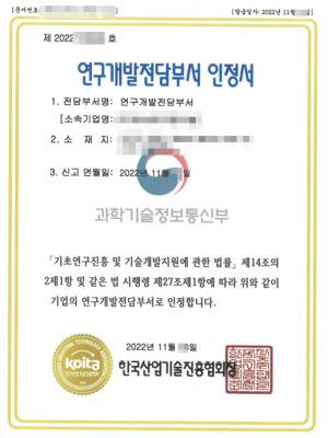23년 02월_연구개발전담부서 인정서 발급 완료사례